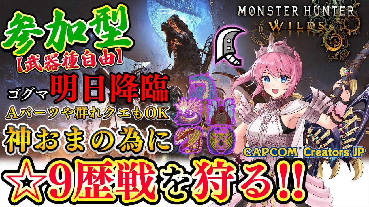 YouTubeで詳細を確認=>【参加型】ゴグマ明日降臨!!Aパーツ集め&神おまの為に☆9モンスターなど狩りまくる!🔥【モンハンワイルズ】
